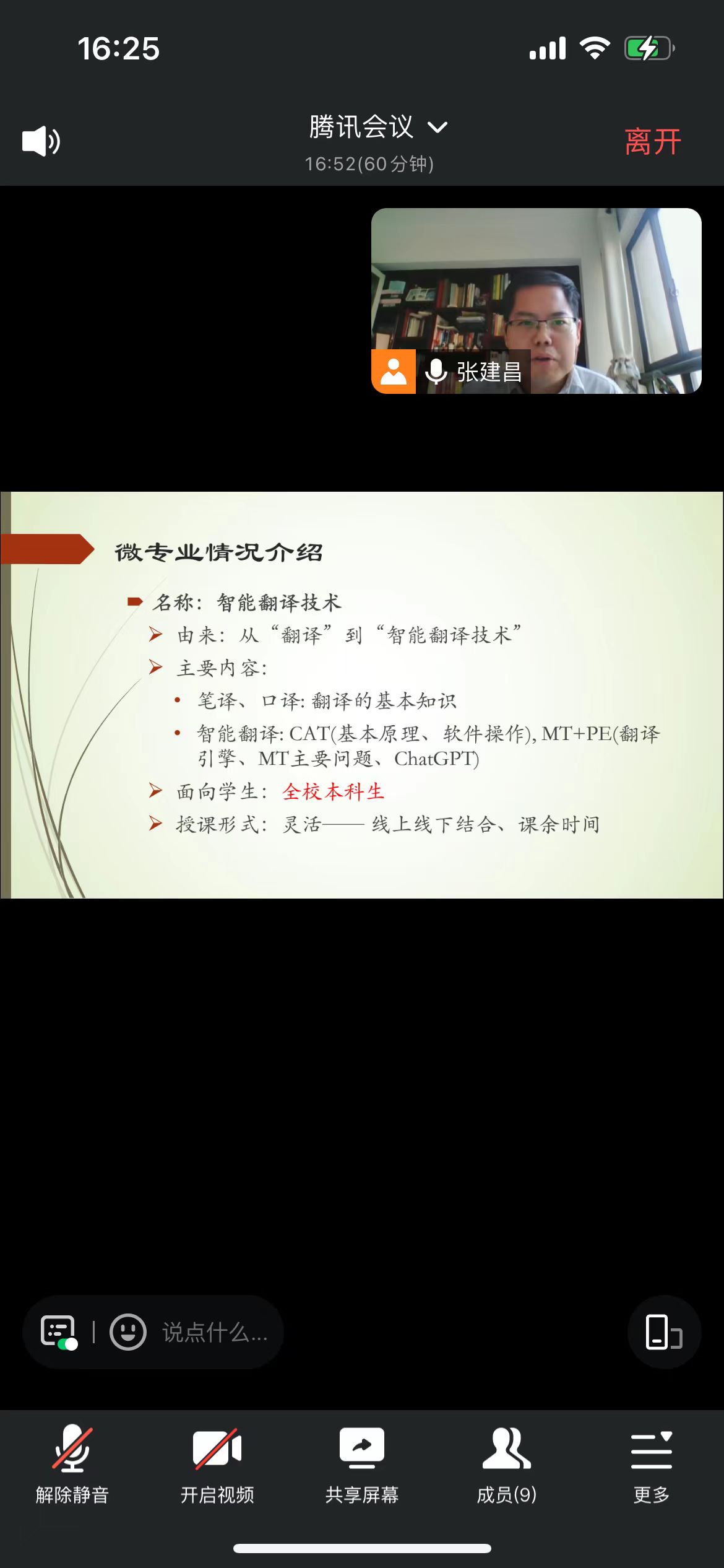 23日下午,学院线上召开微专业建设推进会,就新获批的“智能翻译技术”微专业进行介绍及工作安排。王新平院长、李焱副院长以及微专业建设团队成员参加会议。