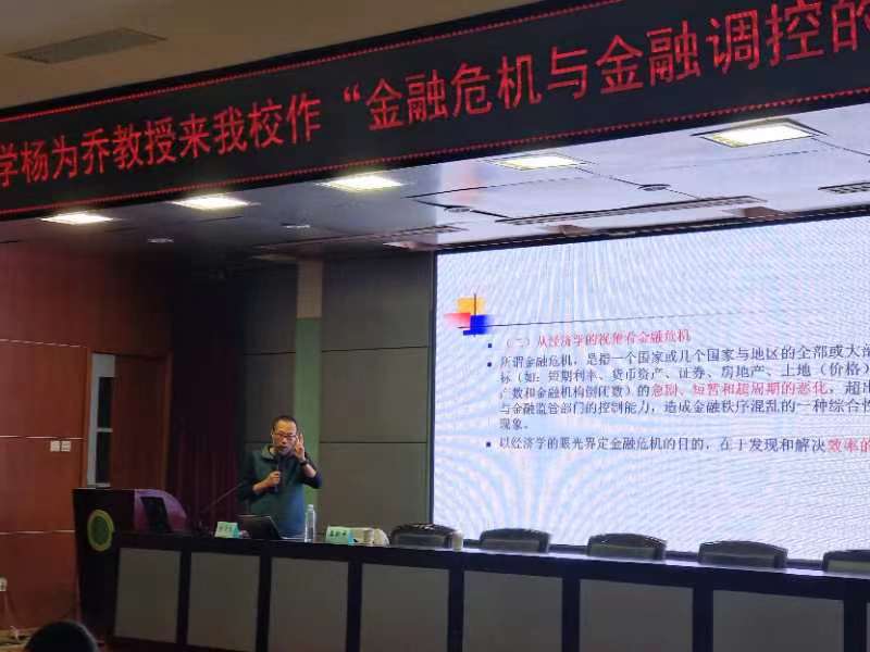 杨为乔副教授长期从事金融法、经济法以及公司企业法课程的教学科研工作,兼任中国商业法学研究会常务理事、中国法学会银行法学研究会理事、中国法学会海峡两岸关系法学会理事等社会兼职。本次学术讲座主要围绕金融危机的法律本质、金融危机与金融调控关系的因果之辩、金融调控应对金融危机的法治保障及应对机制,进行深入浅出地讲解剖析,并进一步提出了相关的思考与启发。