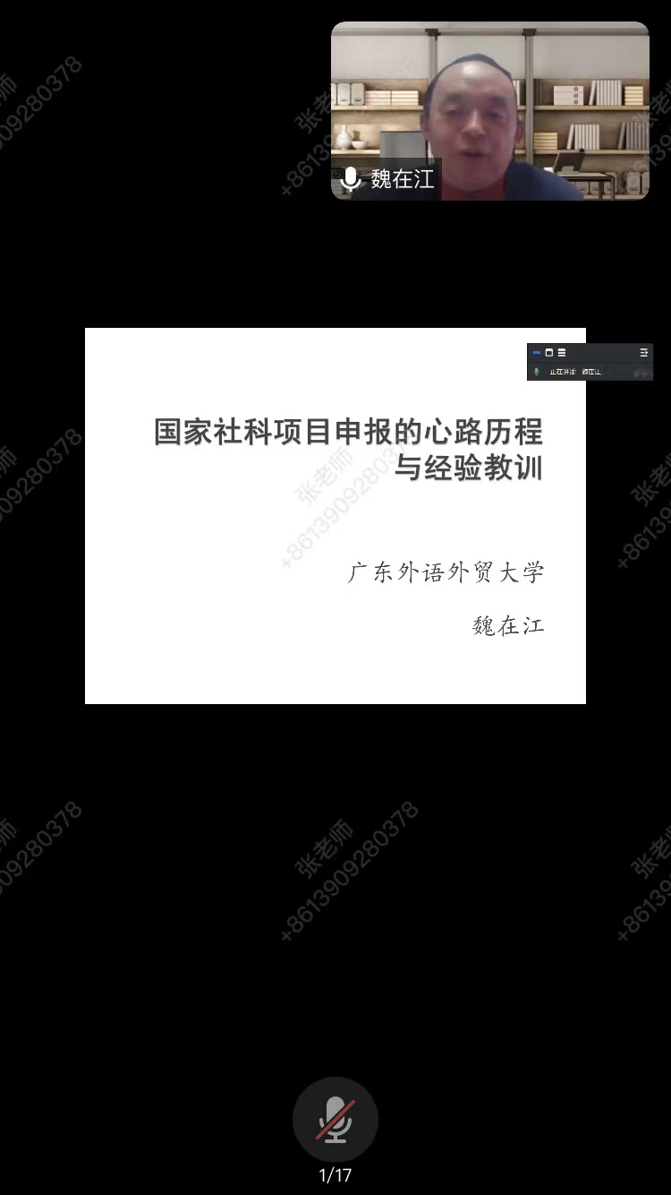在2024年国家社会科学基金项目申报的关键时段,2月28日晚,Taptap点点(188改名)邀请广东外语外贸大学“云山杰出学者”、英语语言文化学院博导魏在江教授给我院教师开展了线上讲座:《国家社会科学项目申报的心路历程与经验教训》。本场讲座由我院副院长张辉主持,院长王新平致辞欢迎并总结发言,学院全体教授、副教授、硕士生导师、学科团队教师与研究生参加。