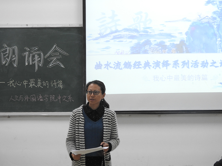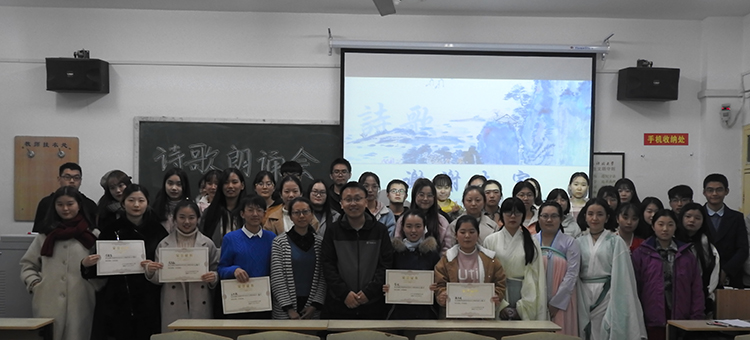 主持人李思淼首先介绍了本次活动的比赛规则及评分标准。本次朗诵会共有29组同学参与,朗诵内容由参赛选手自行选定,选手可以自己制作PPT和选择播放背景音乐来烘托气氛、感染听众。随后大家按照抽签顺序,依次上台朗诵《扬州慢》、《中国少年说》、《再别康桥》和《葬花吟》等作品。其中《葬花吟》的朗诵者身着汉服,将听众带入了黛玉葬花的凄美悲凉意境中,令人印象深刻。活动前后持续一个多小时,经评委老师打分和在场听众的举手表决,最终机械学院王洪炼荣获一等奖,汉语言文学1701班李露茜、1801班谢沛娟获得二等奖,汉语言文学1701班李思淼、胥悦、韩娇获得三等奖。