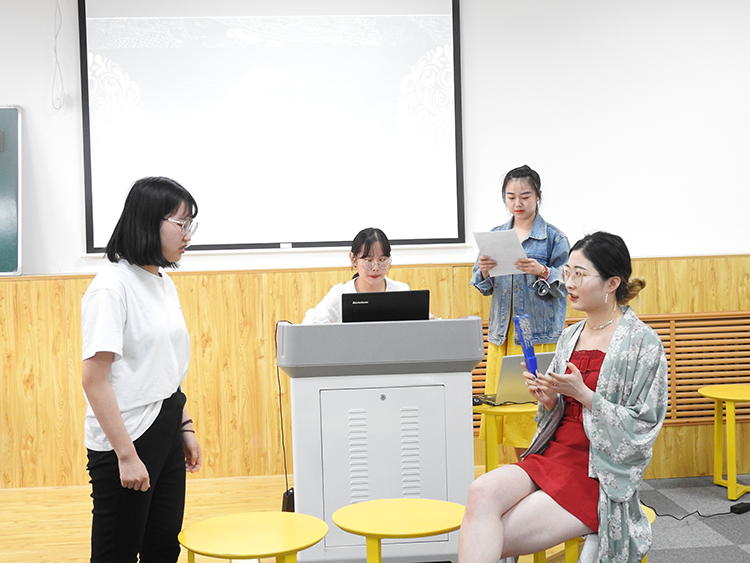 第五组“群魔乱舞的葫芦娃”生动改编了苏童发表于90年代的中篇小说《妻妾成群》,演绎者分别抓住四个妻妾和男主角陈家少爷的性格特点,再现了陈家在“妻妾成群”明争暗斗中走向精神崩溃的悲惨命运。尤其几位同学同台表演时强烈的戏剧冲突,更是将活动氛围推向高潮。