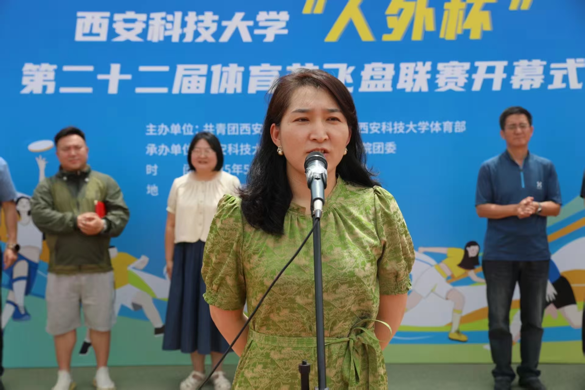 费秀水在致辞中,对各位领导和老师的到来表示热烈的欢迎,为筹备此次联赛付出辛勤努力的工作人员表示衷心感谢,希望学生通过本次飞盘联赛在携手奋进中深化集体荣誉感,感受团结协作的力量,深刻领悟体育精神的内涵,在突破自我、追求卓越中书写属于自己的人生价值。