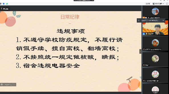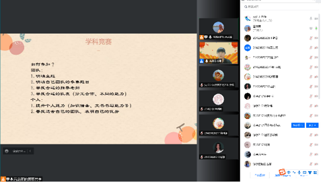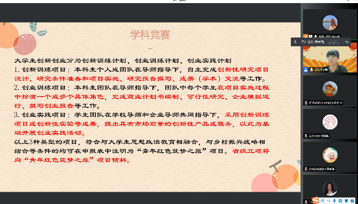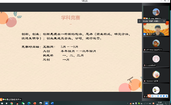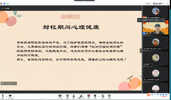 王娟在向全体同学强调了疫情防控期间个人卫生心理健康的重要性的同时鼓励同学们积极参加学校举办各类学科竞赛,以赛促学王维蒙呼吁同学们正视疫情,不要违反学校规定,并建议大家保持乐观心态,积极调整自己的情绪雷鑫雨进行了大创比赛经验分享,鼓励大家参与创新创业竞赛,提升个人知识储备与创新能力。