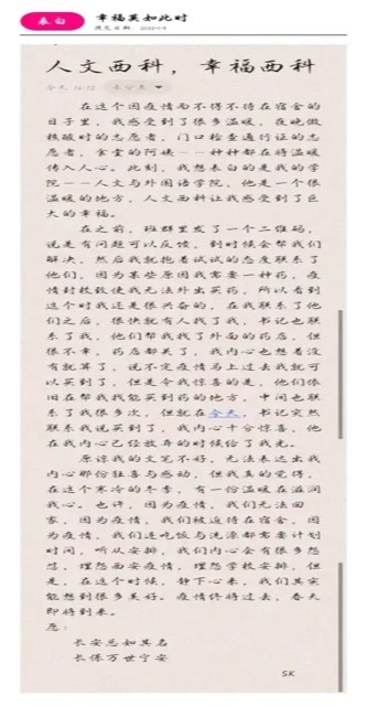 收到一名学生通过平台反馈自己的药物需求后,学院党委非常重视,安排专人联系安抚该同学,并在疫情期间许多药店关闭的情况下,多方打听寻找,一家药店买不到、第二家药店也没有……终于在问了很多家药店后,帮孩子买到了药品。“他在我内心已经放弃的时候给了我光” ,这位向学院求助的同学如是说。“硬隔离,阻断的是新型冠状病毒传播,阻不断的是党员干部与群众的情感,是老师对学生的深深关切。”