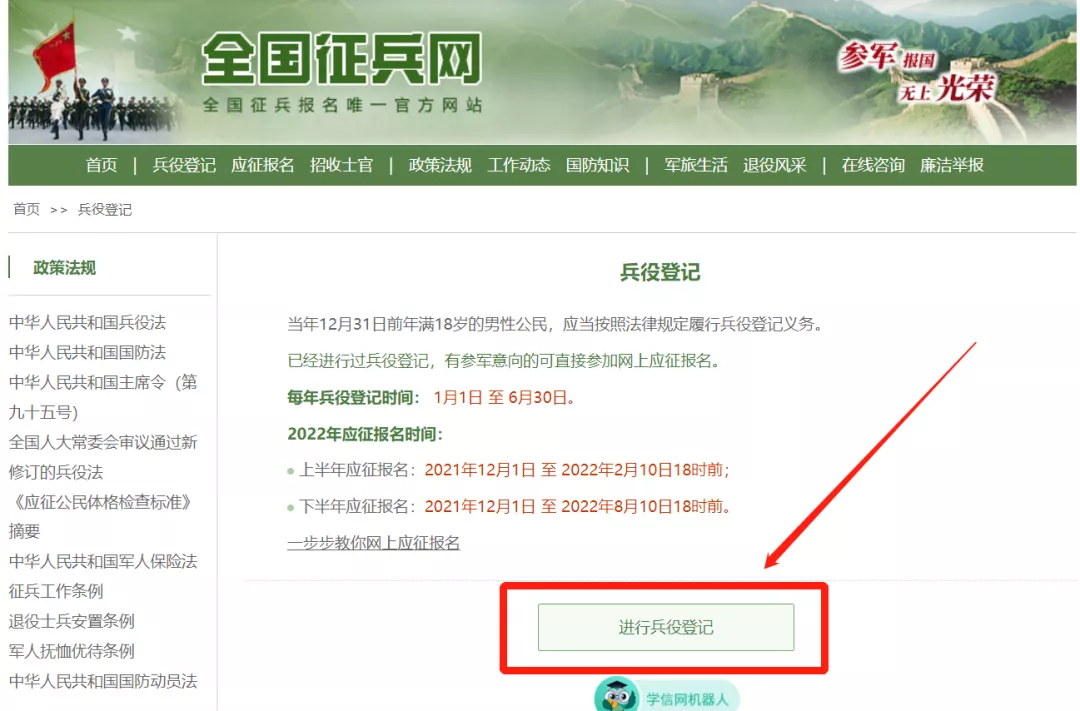 在这个页面中,会告知报名时间以及参军政策说明,建议大家认真阅读后,点击“进行兵役登记”,迈出你军旅生涯的第一步!