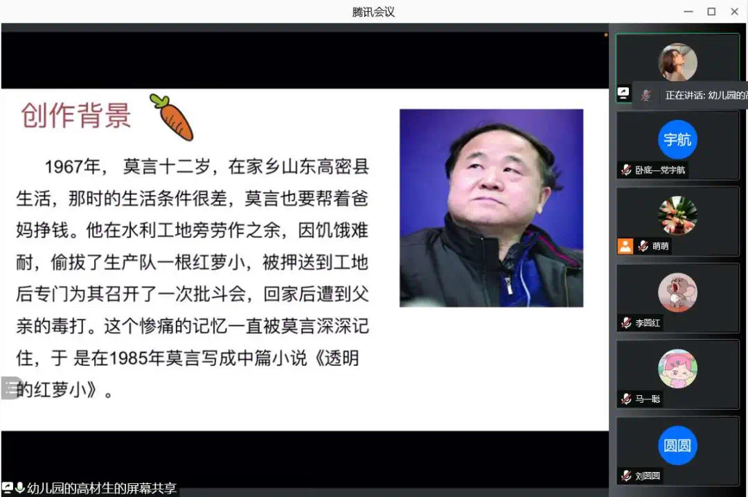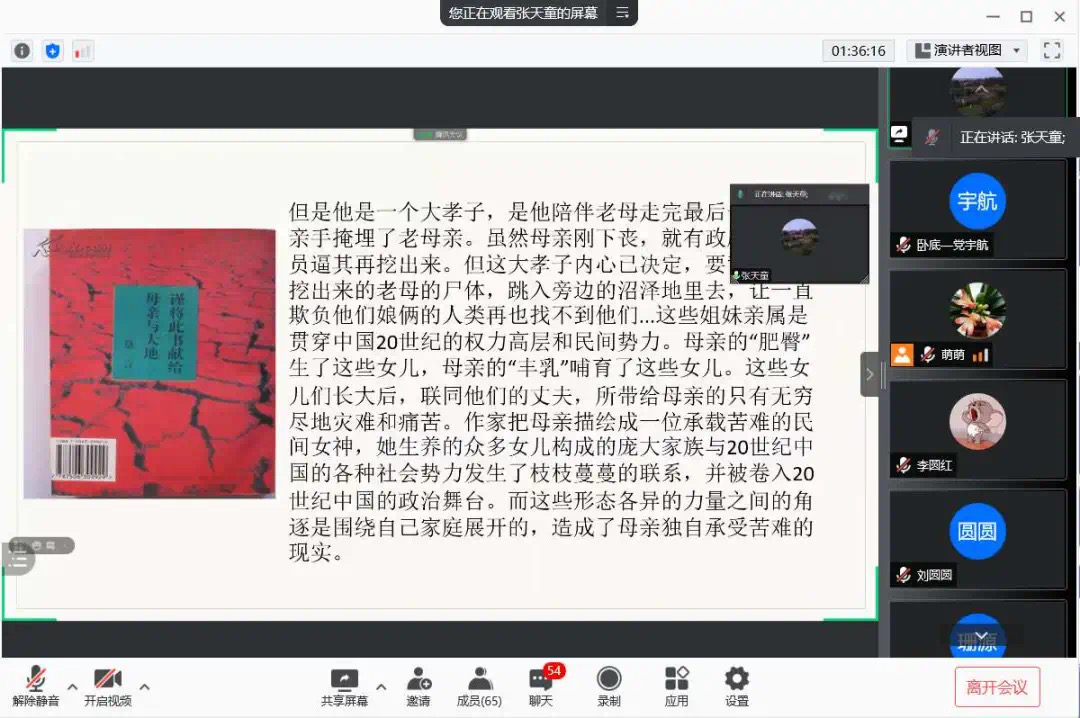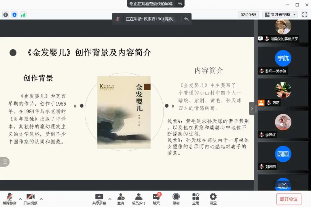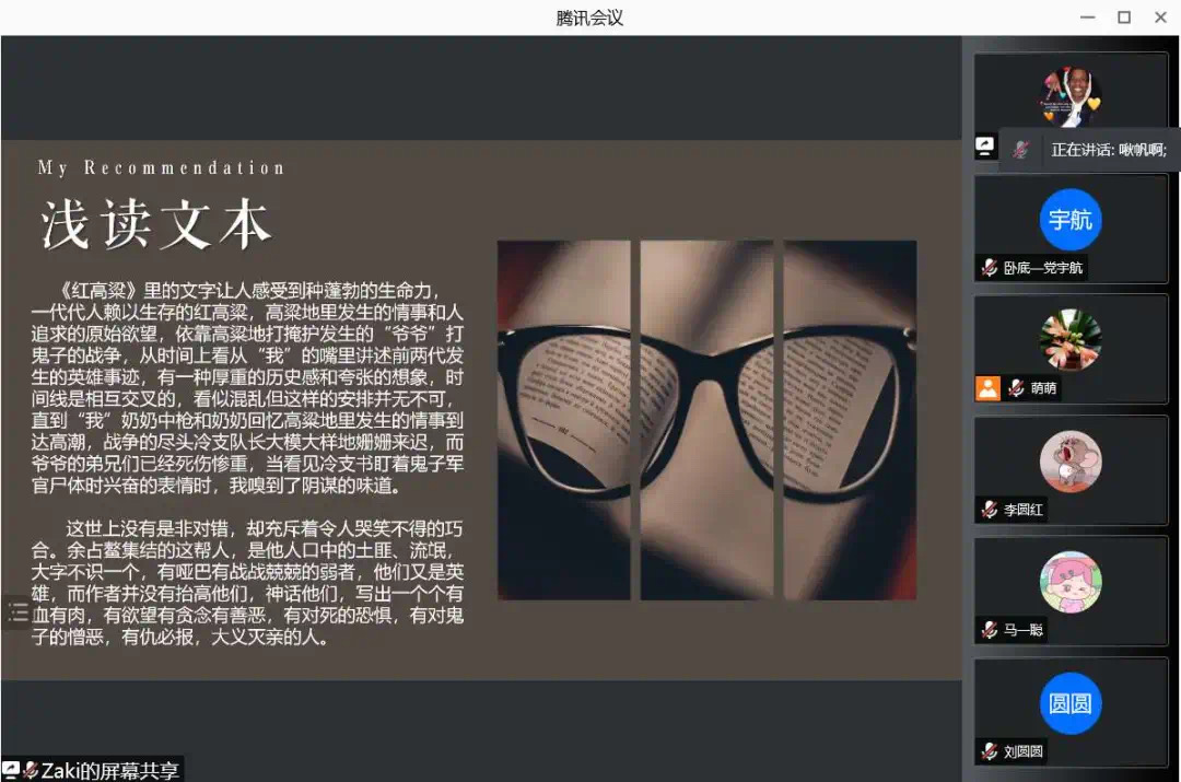 为了使大家多读书,好读书,读好书,并且“熟读而精思”,2021年10月11日,Taptap点点(188改名)汉语言文学专业举办了以“莫言的小说”为主题的线上读书交流会。指导老师郭萌及汉语言文学专业19级全体同学参加活动。