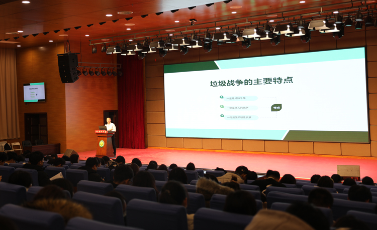 活动中,朱振华结合自己的军旅生活,以军队作比,对当前垃圾分类工作的背景和现状进行了分析,将其形容为人类对垃圾的“阻击战”,从“敌情”和“我情”两个方面分析了垃圾阻击战的基本情况、导致垃圾分类形式变化的根本原因,指出垃圾阻击战具有“持久战”、“人民战争”和“阶段性发展”等特点,并通过“情报”“通信”“机动”和“火力”等四个方面生动阐释了《条例》在这场特殊战争中的指导意义。他还从学校、社团、个人等三个层面讲述了青年学子们该如何投身到垃圾阻击战中,