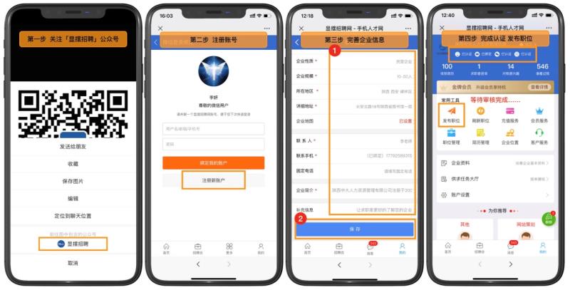 移动端:微信识别上方二维码关注进入公众号,点击右下角【显摆招聘会】→【登录/注册】→点击微信图标→注册新账户→完成账号注册→选择【我是招聘者】→完善企业信息→认证邮箱、营业执照→等待审核→发布职位。