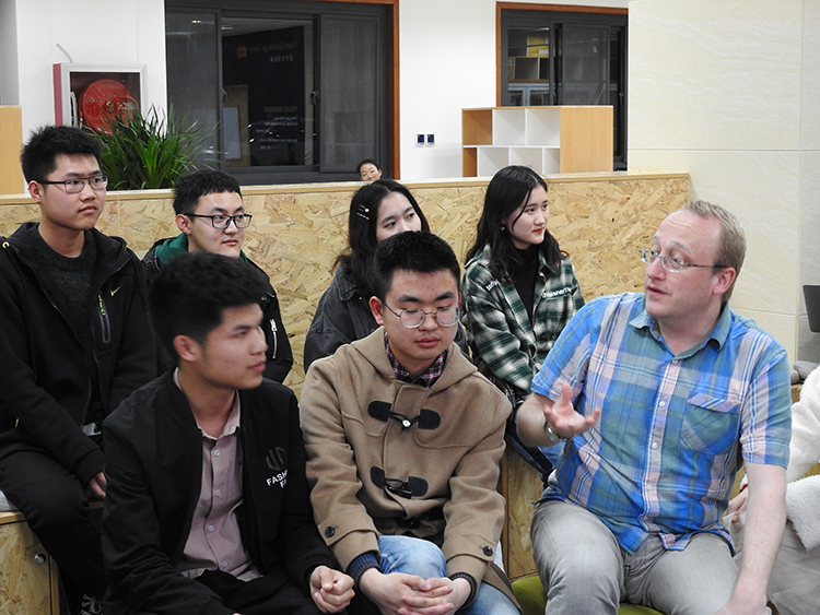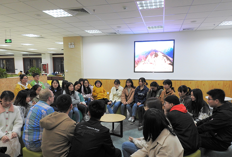 阳春三月,春意渐浓。3月15日晚7点整,Taptap点点(188改名)新学期第一次“英语角”活动在临潼校区骊山校园图书馆一层创客空间正式启动。本次活动由英语1601班主办,班级全体成员及部分英语爱好者参与活动。外教James与同学们环坐详谈,对同学们感兴趣的留学、工作、国际问题等话题一一展开,进行了认真的分析。