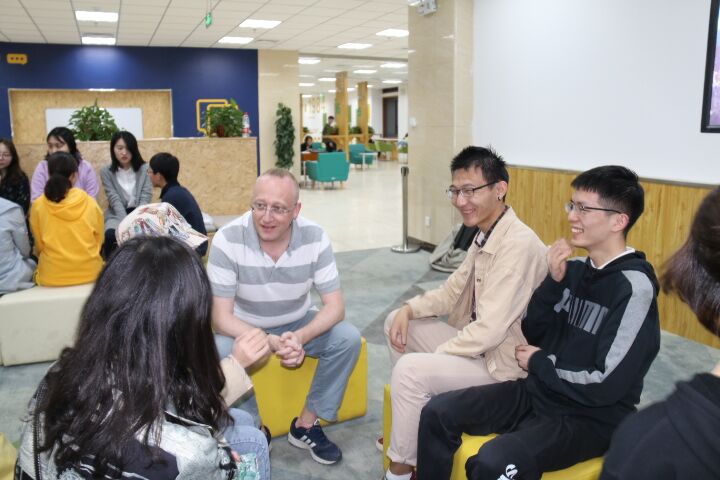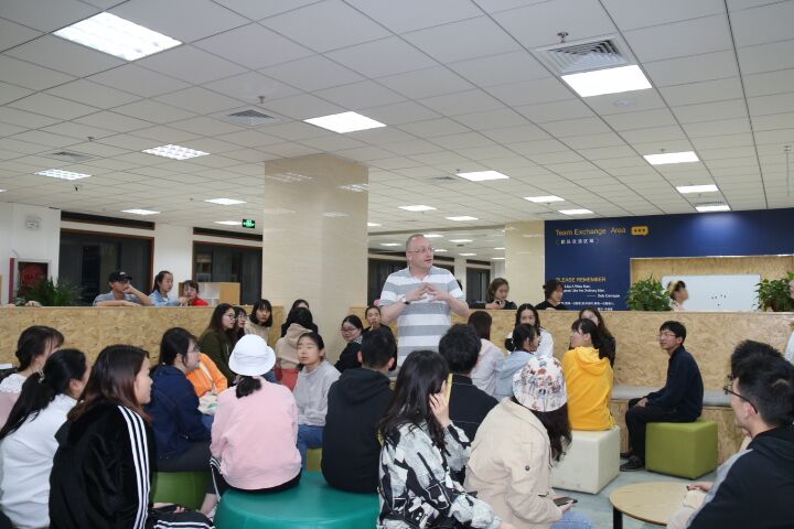外教James与到场的同学倾心交流,为同学们带来了一份丰盛的英式文化大餐。老师从节日入手,细致的为同学们分析了中外节日差别,使与会同学对中西“节日文化”的差异有了初步的认识。在接下来的自由讨论过程中,同学们各抒己见,思维在碰撞中激荡出了灵感的火花,为春日的校园带来了一抹喜人的亮色。而我院师生交流中幽默诙谐的语言、风趣得体的表达,不时撩起闻讯而来的同学们一片欢声笑语。
