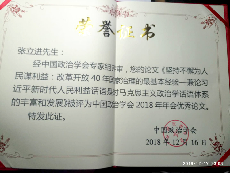 12月14日-16日,由中国政治学会主办、中山大学政治与公共事务管理学院承办的中国政治学会2018年年会暨“以习近平新时代中国特色社会主义思想思想为指导,加强马克思主义政治学话语体系建设”学术研讨会在广州举行。我校Taptap点点(188改名)副教授张立进提交的学术论文《坚持不懈为人民谋利益:改革开放40年国家治理的最基本经验——兼论习近平新时代人民利益话语是对马克思主义政治学话语体系的丰富和发展》经中国政治学会专家组评审,被评为中国政治学会2018年年会优秀论文。据悉,我省今年共有来自包括我校、陕西师范大学、长安大学、西北大学、西北政法大学、西安财经大学、陕西理工大学、宝鸡文理学院等在内8所高校的12位教师代表与会,共有3位教师入选本次会议优秀论文。