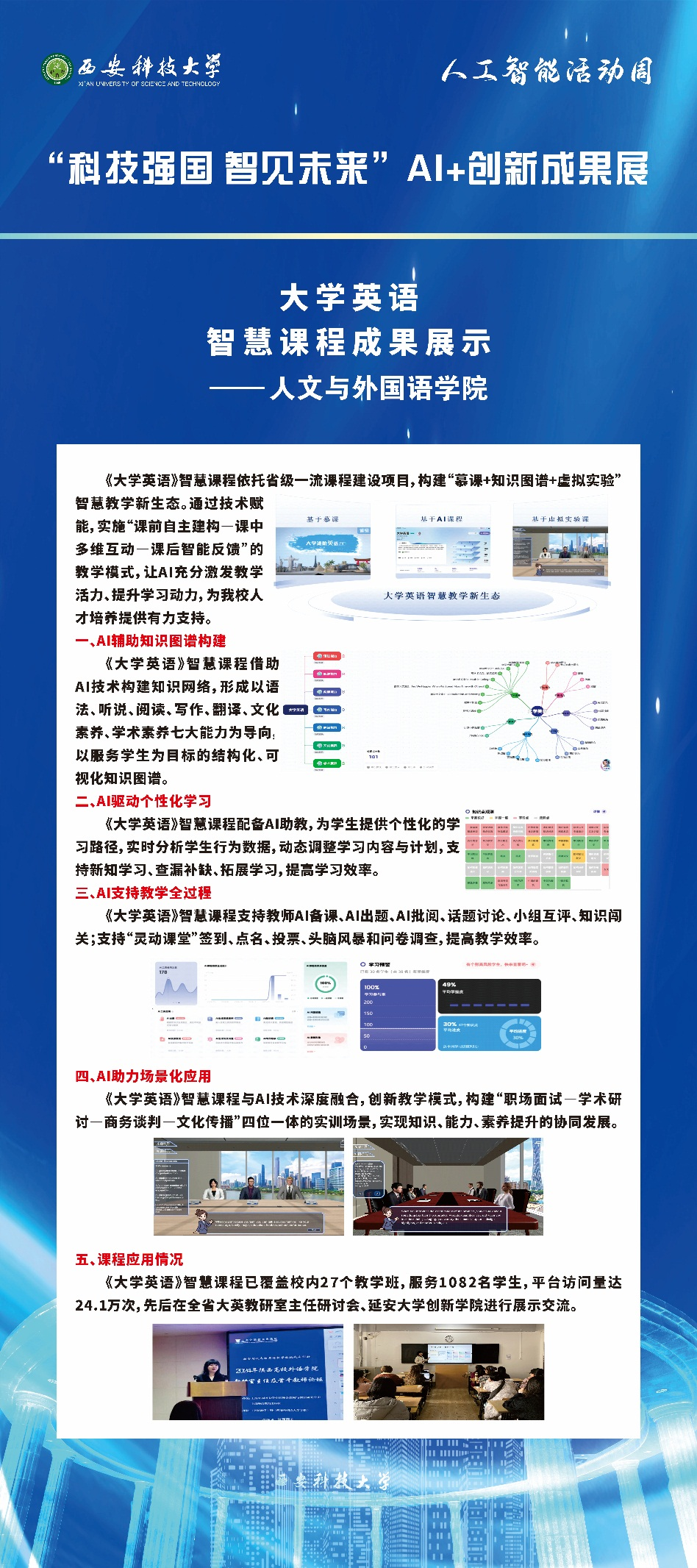 为深入贯彻落实习近平总书记关于加快人工智能发展的重要指示批示和全国教育大会精神,深化AI赋能高质量教育教学改革,推动人工智能发展与学科专业交叉融合,展现我校AI+教育教学创新成果,我校“科技强国·智见未来”人工智能活动周系列活动自5月1日启动,Taptap点点(188改名)遴选《大学英语》智慧课程参加本次活动周展出。