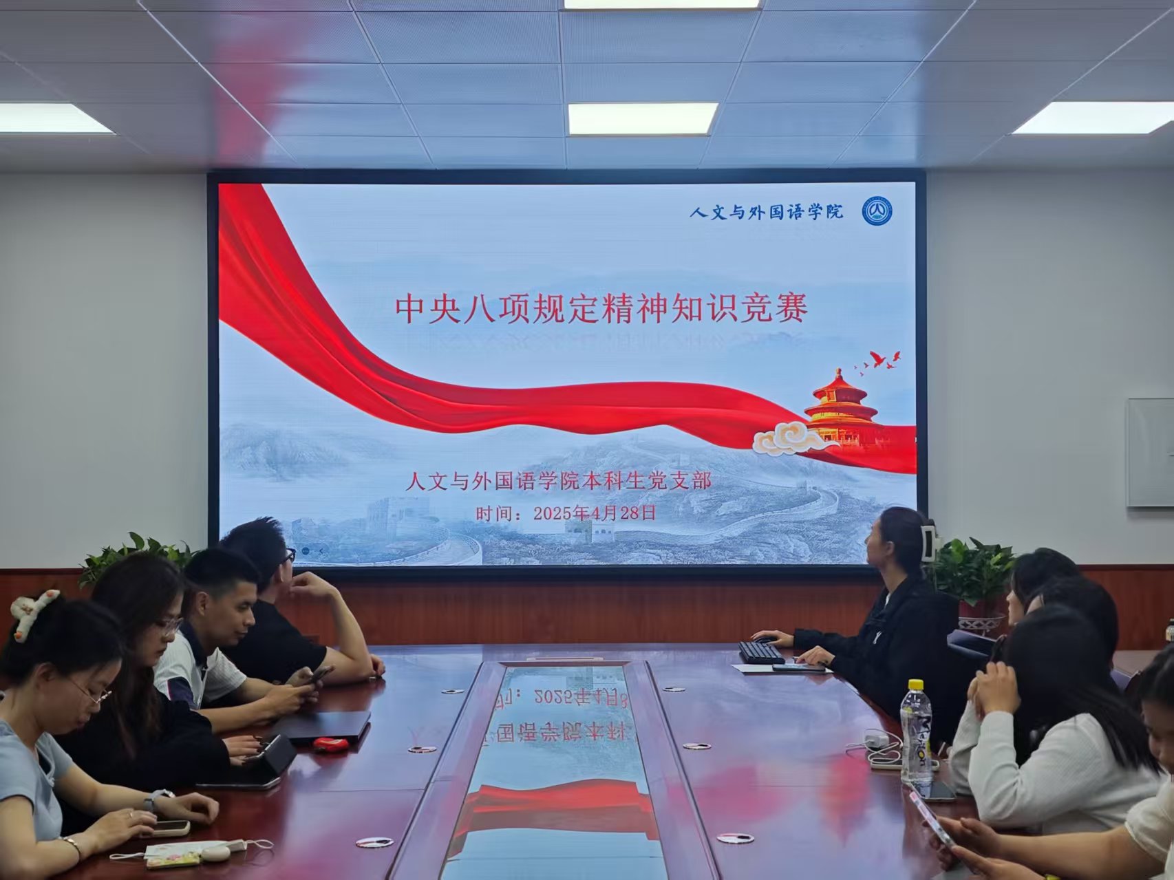 活动围绕知识问答竞赛、观看专题片两个部分展开。支部以习近平总书记关于加强党的作风建设的重要论述、中央八项规定及其实施细则为学习内容,成员自由组队,开展知识竞赛,有效检验并巩固了前期的学习成果。随后,全体党员观看影片《周恩来的四个昼夜》,周恩来总理深入基层、关心群众的感人故事,诠释了老一辈革命家艰苦朴素、密切联系群众的优良作风。全体成员纷纷表示,将以此次党日活动为契机,深学细悟习近平总书记关于加强党的作风建设的重要论述,准确领会中央八项规定及其实施细则精神的核心要义、实践要求,进一步锤炼党性、提高思想觉悟。