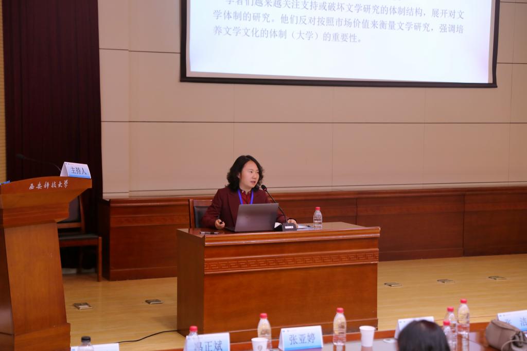 第三场主旨报告由陕西师范大学外国语学院博士生导师张亚婷教授主持。主讲嘉宾西安外国语大学芮小河教授的报告题目为:“当代英美文学研究的‘体制转向’”,芮教授首先介绍了自20世纪90年代起,英美文学研究从传统以文本为中心的分析转向对文学生产过程的参与者以及围绕这些参与者所形成的各种组织机构和网络的研究,包括编辑、书商、书评人、出版社、期刊、文学奖、图书俱乐部、高等教育机构、数字平台等社会现象,提出了文学研究的“体制转向”(Institutional Turn)这一新概念,认为研究者们分析文学与塑造文学的各种体制之间复杂的相互作用的目的在于揭示影响文学生产的驱动力和权力结构,并力图在日益被新自由主义意识形态所主导的西方社会中捍卫文学研究的价值。芮教授强调,英美文学研究的“体制转向”整合文学研究与社会学、经济学、媒体和数字研究等学科的跨学科视角,不但拓展了文学的研究视野,在文学研究方法上进行创新,而且在应对当前文学研究乃至人文学科所面临的挑战方面进行了有益的尝试。